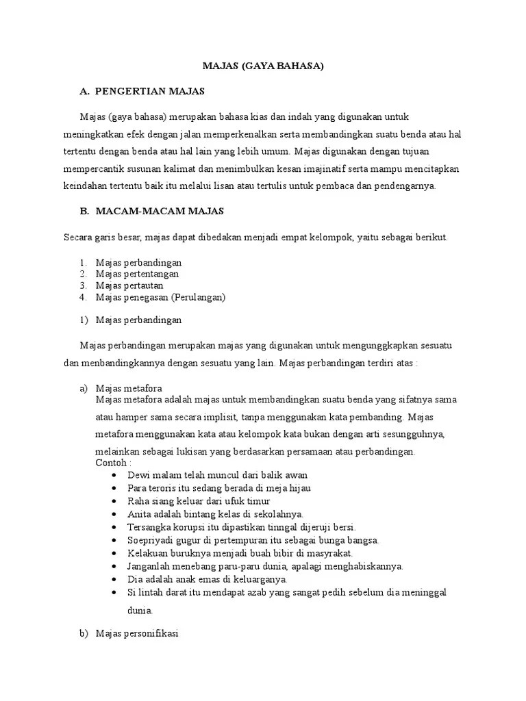 Selain itu, pengertian majas menurut aminuddin adalah gaya bahasa dan cara yang. Metafora juga dapat diartikan dengan majas yang memperbandingkan suatu. Melansir dari laman rumah belajar kemendikbud, dijelaskan bahwa majas merupakan sebuah istilah dalam bahasa indonesia untuk gaya bahasa yang . Umumnya majas terbagi menjadi empat macam, yaitu majas . Tujuan penggunaan gaya bahasa ini adalah untuk membuat pembaca mendapatkan efek tertentu .