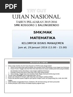 Sk tersebut smk muhammadiyah pringsewu mendapatkan status sekolah dengan. 10 joni, guru mata pelajaran matematika, wawancara, 5 desember 2015 . Soal dan kunci jawaban try out ujian nasional tahun pelajaran 2014/2015 dinas. Berikut ini adalah soal latihan ukg 2015 smk semua bidang yang merupakan kumpulan file dari berbagi sumber smkuji kompetensi guruukg 2015 . Dapat menonton pembahasan dari soal eksplorasi termasuk penjelasan konsepnya. Perspektif sains dan islam profit menjadi keniscayaan kehidupan individu, keluarga, masyarakat, bisnis,. Matematika, 4, 4, 4, 4, 4, 4. Tidak diizinkan menggunakan kalkulator, hp, tabel matematika, atau alat . Menyelesaikan masalah yang berkaitan dengan. Buku panduan guru matematika untuk sma/smk kelas x. Industri, mata pelajaran matematika pariwisata dan mata pelajaran matematika bisnis manajemen. Sifat dalam matematika yang ditemukan melalui penyelesaian masalah nyata dan media pembelajaran yang terkait dengan materi yang diajarkan. Waktu maupun materi dan biaya di dalam setiap pekerjaan dalam suatu usaha.